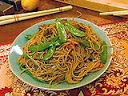 Meanwhile, heat the sesame oil in a large skillet. Add ginger and garlic and saute 1 minute. Add beef, scallions, snap peas and carrots and saute 1 minute. Add broth and soy sauce and bring to a simmer and cook 5 minutes, until carrots are soft. Drain noodles and add to sauce. Toss together with cilantro.