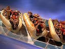 Reheat the broth, and add the sliced meat. Place some meat on each toasted roll, ladle with some broth and top with giardiniera vegetables and red peppers.