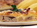 Butter a 9 by 13 glass baking dish. Butter both sides of the bread and layer 6 of them into the bottom of the baking dish, overlapping them as necessary but keep them even. Layer the slices of ham on top of the bread and then the bananas, 6 more slices of bread, then the cheese, potato chips, and bacon. In a separate bowl, beat together the eggs, milk, cream, nutmeg, salt, and pepper. Pour this over the casserole almost to the top. Bake for 45 minutes until brown and bubbly. Cut into squares and remove with a spatula, like lasagna.