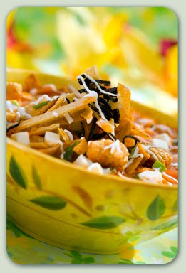 Sirve en un plato hondo el caldo bien sazonado y encima las tiras de tortilla fritas. Acompaña con queso rallado, trocitos de chicharrón, el chile pasilla frito, y aguacate en rebanadas.