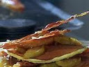 To serve, lay the pancakes on a plate and dust with confectioners' sugar. Serve with roasted apples, crispy prosciutto strips and warm maple syrup.