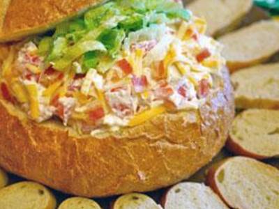 Place the bread bowl onto a serving platter. Spoon the dip into the center of the bread bowl. Top with the remaining 1/4 cup shredded cheese, crumbled bacon and shredded lettuce.
