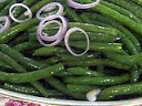 Place 5 cups of water to boil with salt, once the water has reached a rolling boil, remove from the heat and add the string beans to the water for about 5 minutes. Strain the string beans through a colander and run under cold water.