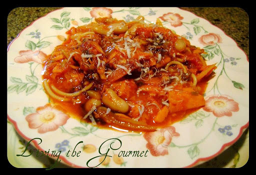 Place some spaghetti in a bowl and top with the soup. Drizzle a teaspoon of Balsamic Vinegar on top of the soup for a really nice flavor addition. You also can top with some grated Romano cheese and a little extra drizzle of olive oil.
