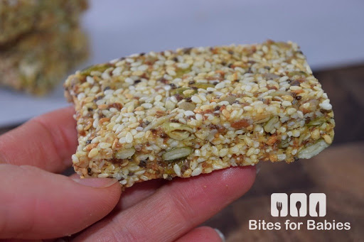 Add all the dry ingredients to a large bowl. Heat the honey and peanut butter in the microwave on high heat for 20-25 second intervals until melted. Mix until smooth then add to the bowl of dry ingredients. With a large wooden spoon or spatula, mix all the ingredients until combined all the seeds and nuts are coated with the honey and peanut butter mixture. Transfer mixture into a shallow pan (I used a 12 by 5.5 by 2 inch biscotti pan) and firmly pack down with a spoon until uniform. Set in the fridge for 1-2 hours or until fully cooled and firm. Cut into desired portions.