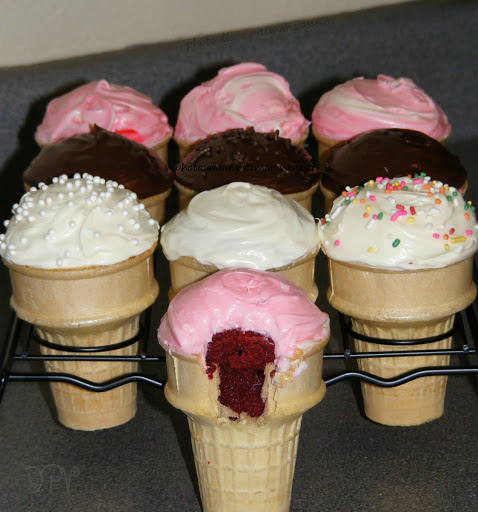 Prepare cake batter as directed. Fill ice cream cones about 3/4 full and stand each one upright in a standard size muffin pan (or in the handy little baking rack shown). Carefully place in the oven and bake as directed for cupcakes. (Jumbo cones take about 17-20 minutes.) Remove cupcakes to a cooling rack to cool completely.