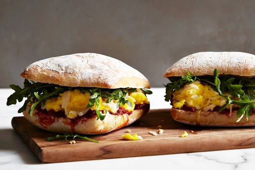 Meanwhile, spread ‘nduja on one half of ciabatta roll. Top with scrambled eggs, arugula and remaining bread half.