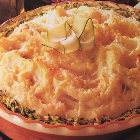 Hidden beneath layers of fluffy mashed potatoes and baked zucchini crust are savory meatballs-what a tasty surprise.