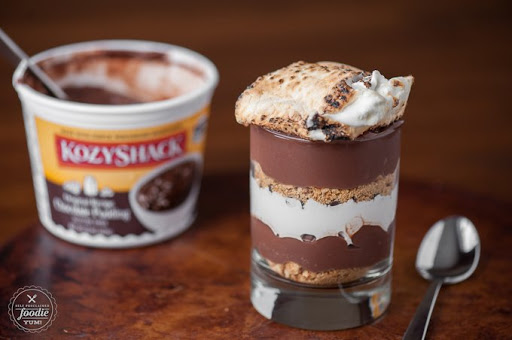 To toast your marshmallow over the burner, stab with two skewers. If you use just one, it will be difficult to rotate as it melts. Hold marshmallow high above the flame because the heat will melt it perfectly - any closer and it will catch on fire. Smash toasted marshmallow on top of final layer of pudding. Serve immediately.