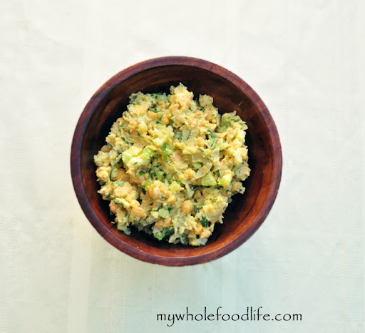 In a medium sized bowl, mash the chickpeas slightly with a fork.