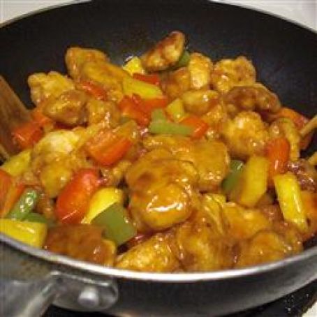 When ready to serve add bell peppers, pineapple onion and chicken to the sweet and sour sauce. Mix together easily and serve over hot rice.