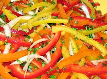 Slice sweet peppers into matchstick-size pieces and place in a large bowl. Slice onion into matchstick-size pieces and add to the bowl. Add parsley or basil. Sprinkle with coarse salt and pepper. Add rice vinegar and sesame oil, stirring to mix well.
