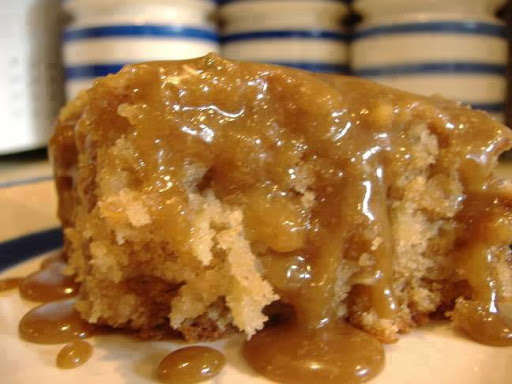 For the glaze combine the butter, brown sugar and milk in a saucepan. Bring to a boil, reduce the heat and simmer for 2 minutes and 30 seconds. Pour the hot glaze over the cooled cake. You may also bake this cake in a 9 X 13 inch rectangular cake pan, in which case the cooking time will only be about 45 minutes.