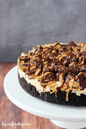 Place the remaining 3/4 cup whipped topping into a pastry bag with a tip. Pipe the topping on the pie decoratively. Drizzle the chocolate and caramel syrups on top, and sprinkle with chopped peanut butter cups.