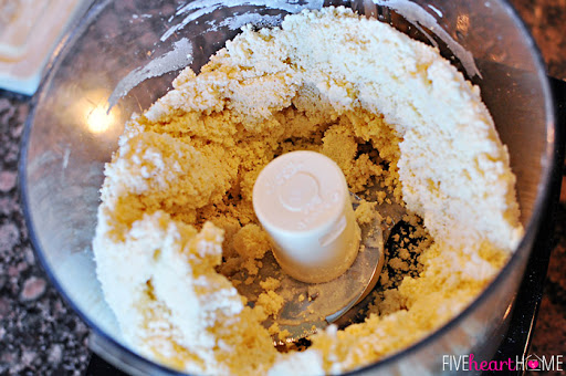 Feed one tablespoon of ice water at a time through the feed tube of the food processor, pulsing 4 to 5 times after each addition. Stop adding water when the mixture begins to form large clumps and pulls away from sides of the food processor bowl.