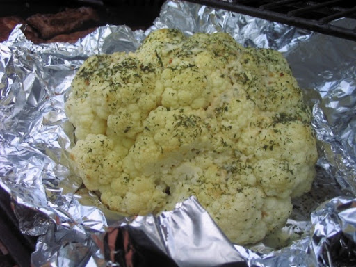 Wrap head of cauliflower in heavy duty aluminum foil.