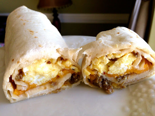 Heat tortillas, one at a time, in large skillet, about ten seconds on each side. Immediately fill with a line of egg/sausage mixture and sprinkle a little cheese over top. roll up tortillas (see photos in this post for how I roll mine) and wrap each one individually in foil, twisting or folding the ends to seal.
