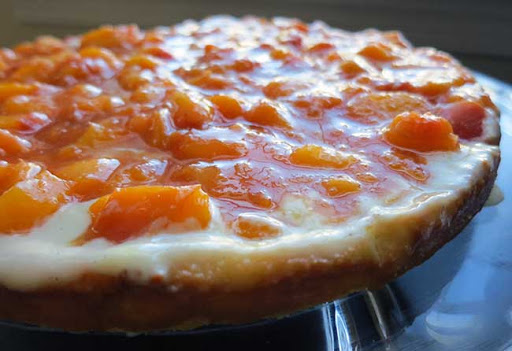 This “pie” (really it’s more like a tart since there’s no pastry top) is super tasty! I call it a peacha pie because it really is similar to a pizza pie: golden crust and sauce with toppings. In my peacha pie’s case, it’s made with an almond crust, a creamy custard-like sauce and a sweet peach topping.