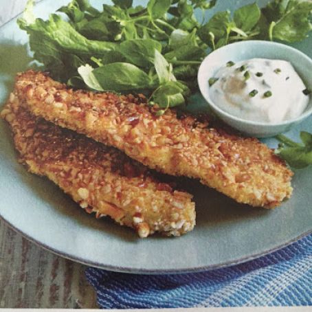 Pretzel Crusted Chicken Breast Tenders with garlicky dipping sauce