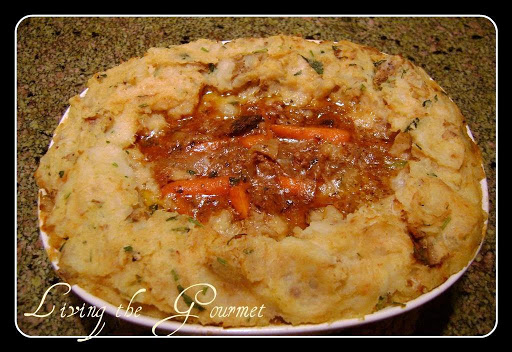 In a casserole coated with olive oil or butter, place meat mixture. Spoon the mashed potatoes around the edges as a border.