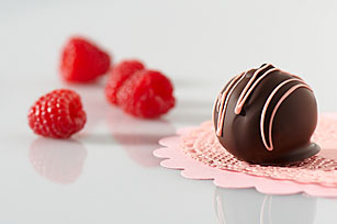 Dip balls in semi-sweet chocolate; place in single layer in shallow waxed paper-lined pan. Drizzle with pink chocolate. Refrigerate 1 hour or until firm. Enjoy!