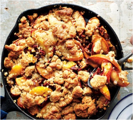 Smear bottom and sides of a 10" cast-iron skillet with butter. Toss pecans, peaches, brown sugar, granulated sugar, lemon juice, garam masala, and salt in a large bowl to combine. Transfer to skillet and crumble topping, breaking up into large pieces, over filling.