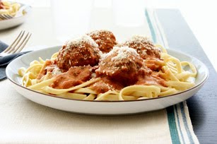 Tomato-Basil Cream Sauce: Mix 1 jar (14 oz.) spaghetti sauce, 2 oz. cubed Cream Cheese and 2 Tbsp. chopped fresh basil in large skillet; cook on medium-low heat 3 min. or until heated through, stirring occasionally. Add 16 hot meatballs; stir to evenly coat. Sprinkle with 1/4 cup Grated Parmesan Cheese before serving. Makes 4 servings, 4 meatballs and 1/3 cup sauce each.