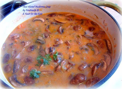 I originally saw recipe for Mushroom Soup on the Pioneer Woman's blog. On a whim, I decided to adapt the recipe with some flavors of Thailand-- coconut, cilantro, lime and red curry paste. The soup turned out to have enough heat to satisfy my need for flavor, and it came together really fast! I'll show you how to make this on my foodblog at http://foodiewife-kitchen.blogspot.com/2010/02/mushroom-soup-gone-thai-inspired-by.html