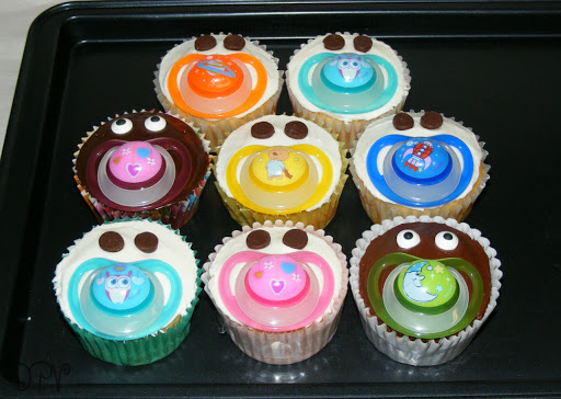 Bake, and cool cupcakes. (Before frosting cupcakes, the tops need to be almost flat so trim off any excess with a sharp paring knife, if needed.) Frost cupcakes and decorate tops with upside down chocolate chips for eyes (or candy eyes) and pacifiers.