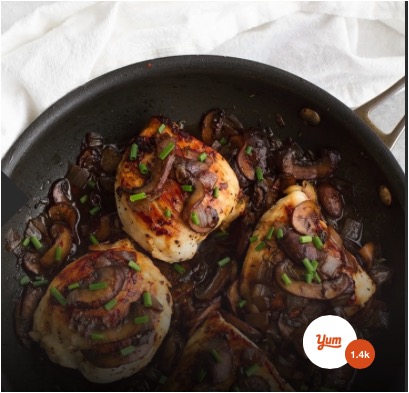 When 10 minutes of baking time remain, prepare the balsamic mushrooms. Heat the same skillet used to brown the chicken over medium high heat. Add the onions and mushrooms. Saute for 1 minute before adding in the roasted garlic; cook for an additional minute. Add the balsamic vinegar, red pepper flakes, and chopped thyme. Heat the balsamic vinegar through for 1 minute then add in the ½ cup of water. Continue to cook until the liquid reduces to about half. Adjust the seasonings to taste. Serve warm with chopped chives or parsley.