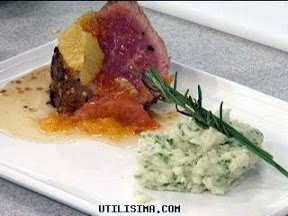 8- En un plato, colocar el lomo de res rebanado, a un costado puré de papa con cebollín y jalea de cítricos.