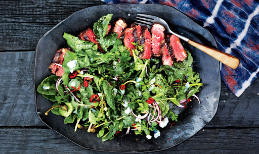 Prepare grill for medium-high heat. Season steaks generously with salt and pepper. Grill, turning several times, until lightly charred, 7–9 minutes for medium-rare. Transfer to a cutting board; let rest at least 15 minutes before thinly slicing.