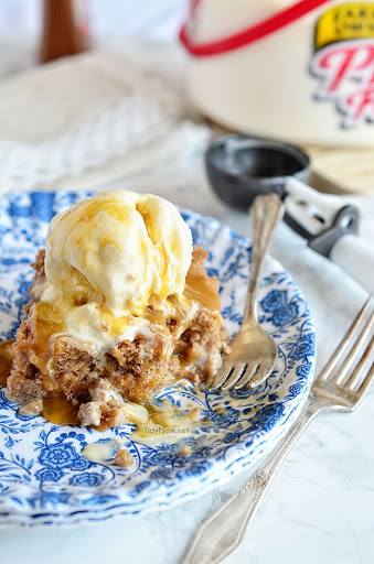 When ready to serve, top each serving with a scoop of vanilla ice cream and drizzle with caramel syrup.
