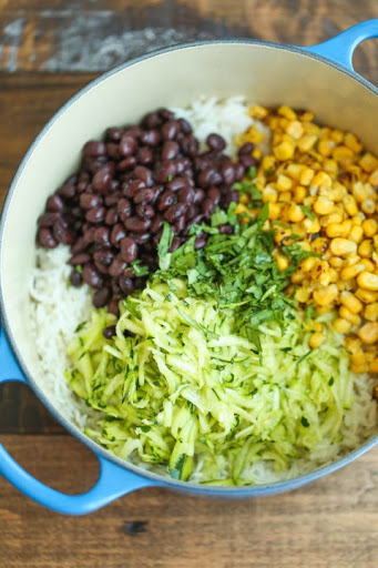 Remove from heat and stir in black beans, corn, zucchini, butter, lime juice and cilantro. Cover and let stand 5 minutes.