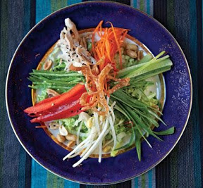 3. Combine cabbage, lettuce, chicken, and cilantro in a bowl; divide between plates. Arrange sprouts, peas, scallions, peppers, carrots, and cucumbers over each salad; drizzle with dressing. Garnish with chiles, sesame seeds, peanuts, and wonton strips. Alternatively, toss everything together in a bowl.