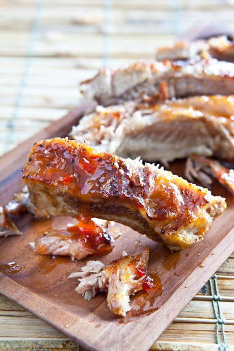 To feed 4 hungry people, start with about 5 pounds of baby back ribs. Actually, you can use the larger St. Louis or country style ribs if you want. Tender baby backs are my thing. The amount of ribs really doesn’t matter – throw in another rack if you’ve got more people.Turn the rib over to the underside — see that layer of white membrane covering the ribs? You’ll want to remove that – it’s tough and stringy.Take a butter knife, wedge it just underneath the membrane to loosen.Pull the membrane up and off the bone.Once you’ve got a section off, use your fingers to remove the rest – just peel it off.Removing this will make your ribs infinitely better.Place all the ribs in a roasting pan, it doesn’t matter if they overlap. Season with salt on both sides.Pepper on both sides.Cover with double-thickness of tin foil. Bake at 275F for 4 hours or so.Use a spatula to move them to a baking sheet.Brush on the sweet chili sauce all over the ribs.Be generous! Brush on a lot.Now move your oven rack to the top 1/3 of the oven and broil for 5 minutes. Keep a good watch on ’em! Don’t let them burn. Alternatively, put on a hot BBQ grill and grill 5 minutes each side. And that’s it! Baby Back Ribs with BBQ sauce.