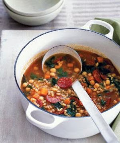 Add the broth, farro, and 2 cups water and bring to a boil. Reduce heat to medium and simmer until the farro is tender, 20 to 25 minutes. Stir in the chickpeas, chard, chorizo, 1/2 teaspoon salt, and 1/2 teaspoon pepper. Simmer until the chard is tender, 3 to 5 minutes.