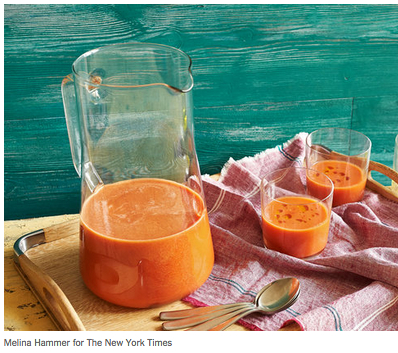 "More of a drink than a soup, served in frosted glasses or chilled tumblers, gazpacho is perfect when it is too hot to eat but you need cold, salt and lunch all at the same time. Gazpacho is everywhere in Seville, Spain, where this recipe comes from, but it's not the watered-down salsa or grainy vegetable purée often served in the United States. This version has no bread and is a creamy orange-pink rather than a lipstick red. That is because a large quantity of olive oil is required for making delicious gazpacho, rather than take-it-or-leave it gazpacho. The emulsion of red tomato juice, palest green cucumber juice and golden olive oil produces the right color and a smooth, almost fluffy texture."