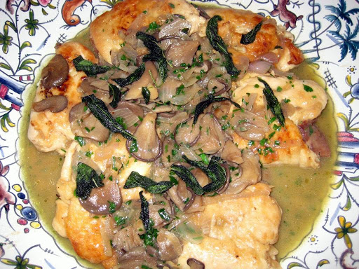 In a 12 to 14-inch saute pan, heat the remaining olive oil until smoking. Add the chicken and saute until golden brown on both sides. Add the shallots and mushrooms and cook until the mushrooms have sweated, about 5 to 6 minutes. Add the Marsala and chicken stock and cook over high heat until reduce by half. Swirl the butter into the pan, add the parsley and serve on 4 warmed dinner plates, topped with the fried sage leaves.