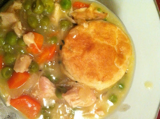 After ten minutes, add the peas and chicken and then simmer for another ten minutes. Taste for seasoning here, then finish with the remaining tarragon and fresh grating of nutmeg. Serve over biscuits.