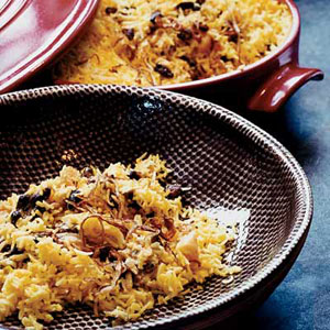 Preheat the oven to 325 degrees. In another large saucepan of boiling salted water, cook the rice until al dente. Drain and return to the saucepan. Stir in half of the saffron milk, cover, and set aside. Add the remaining saffron milk to the pistachio-yogurt mixture.