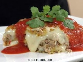 6- Colocar trozos de queso mozzarella sobre el relleno de carne. Repetir la operación hasta terminar con una capa de plátano. Espolvorear con queso rallado y hornear durante 15 minutos en horno bien caliente.