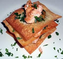 Crispy Wonton and Salmon Napoleon with Parsley-Roasted Garlic Puree