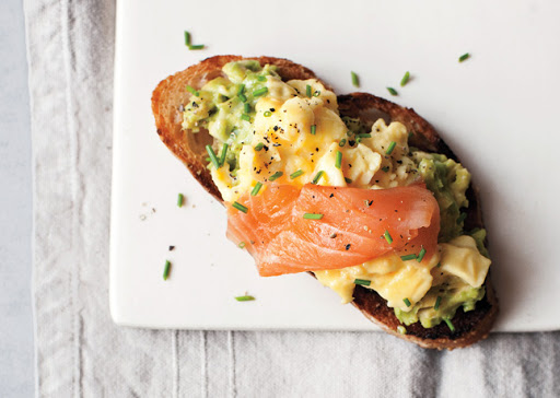 Scrambled Eggs, Avocado, and Smoked Salmon on Toast