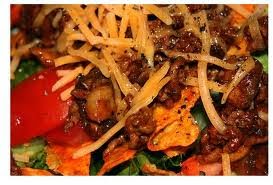 Brown hamburger, drain, mix in taco seasoning. Mix all ingredients in large bowl, except chips.