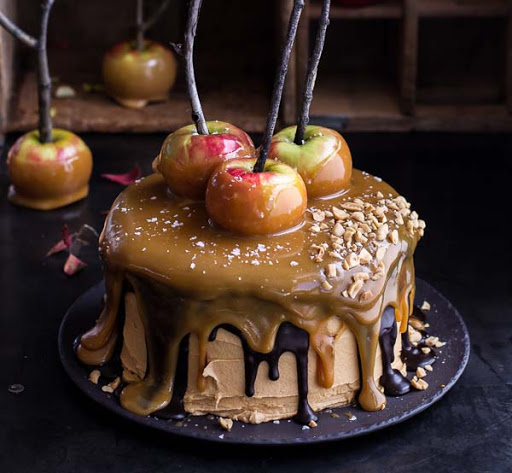 "This cake takes a little TLC for sure, but I think it’s a cake that is worth it. Maybe it’s only a once year cake, but that is what makes it even more special. And the time of year to make it is NOW. I am thinking Halloween, but Thanksgiving would work too. Personally, I think it’s geared more towards Halloween. It has a little spook factor to it, the caramel apples and the whole Snickers thing makes it a dead ringer for Halloween, when everything is all about candy. Although, I didn’t actually use any Snickers in this cake, it’s just Snickers flavored…. but it’s better than a Snickers.