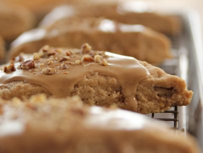 Drizzle a very generous amount of the icing onto each scone, then sprinkle on a few more chopped pecans. Allow the icing to set completely, then serve.