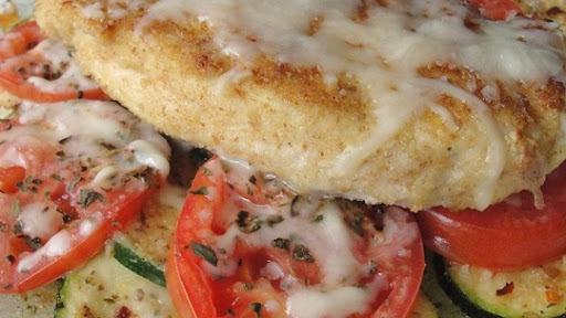 Sprinkle 2 tablespoons reserved bread crumbs over zucchini. Top with tomato slices, 2/3 cup mozzarella cheese, and basil. Place chicken on top of zucchini layer. Cover baking dish with aluminum foil.