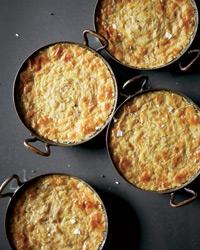 Preheat the oven to 350° and butter eight 5 1/2-inch gratin dishes (see Note). In a small bowl, whisk the flour with the baking powder and 1 teaspoon of salt. In a large bowl, beat the eggs with the heavy cream and grated cheese. Whisk in the dry ingredients until incorporated, then fold in the onions. Spoon the soufflé mixture into the prepared gratin dishes and bake for about 20 minutes, until the soufflés are set and golden on top. Serve right away.