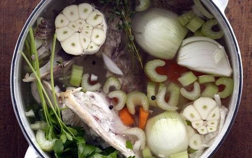 - 2 chicken carcasses left over from roast chicken, any herbs in cavities discarded